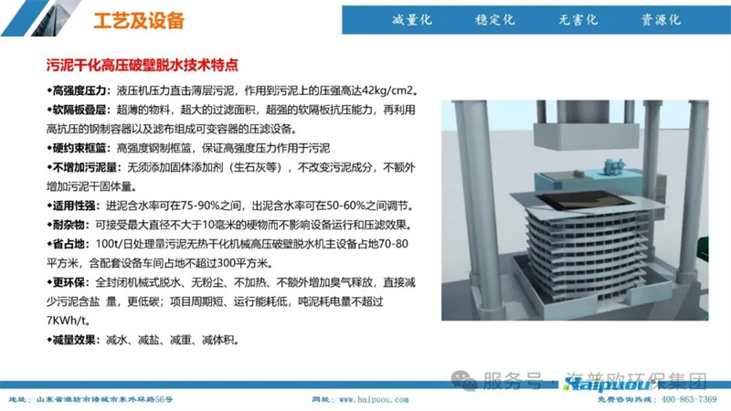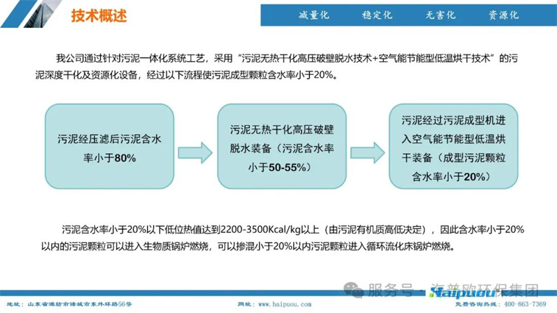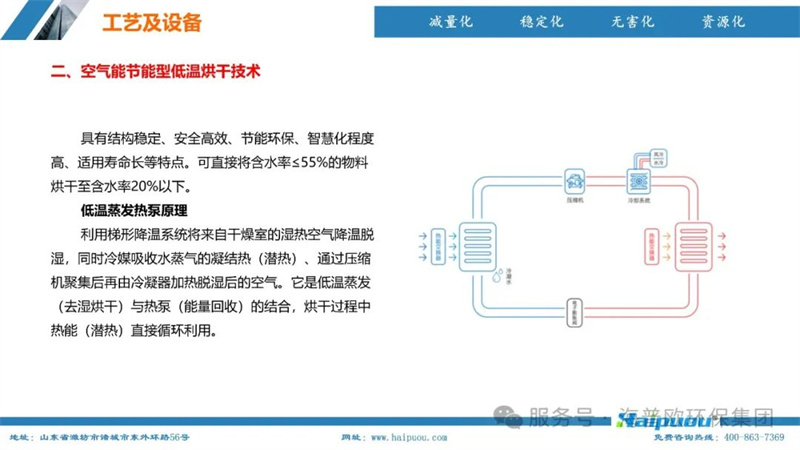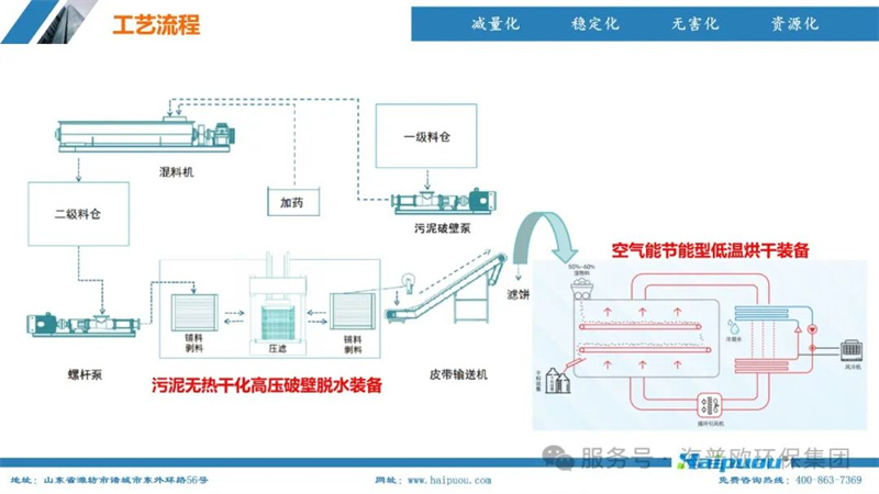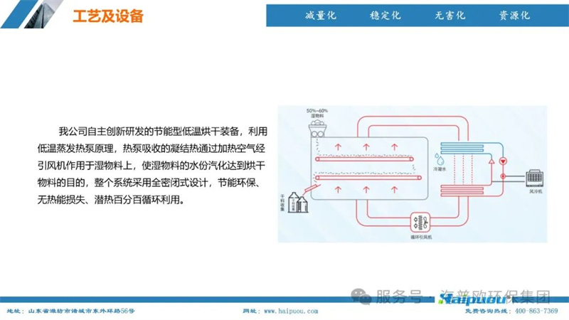 海普歐環(huán)保的核心技術(shù)——污泥深度干化及資源化設(shè)備,采用了“污泥無熱干化高壓破壁脫水技術(shù)+空氣能節(jié)能型低溫烘干技術(shù)”。這一技術(shù)組合能夠?qū)⒑省?5%的物料烘干至含水率20%以下,為污泥的后續(xù)資源化利用提供了堅實(shí)的技術(shù)支撐。其中,污泥無熱干化高壓破壁脫水技術(shù)通過自主研發(fā)的高壓破壁泵,在污泥輸送過程中完成壓力破壁,破壞污泥中微生物細(xì)胞的細(xì)胞膜,使內(nèi)部小分子滲出變?yōu)橥獠克黾游勰嗟牧鲃有裕阌诿撍6諝饽芄?jié)能型低溫烘干技術(shù)則利用低溫蒸發(fā)熱泵原理,將濕熱空氣降溫脫濕,同時冷媒吸收水蒸氣的凝結(jié)熱,通過壓縮機(jī)聚集后再由冷凝器加熱脫濕后的空氣,實(shí)現(xiàn)熱能的循環(huán)利用,具有節(jié)能環(huán)保、安全高效、智慧化程度高等特點(diǎn)