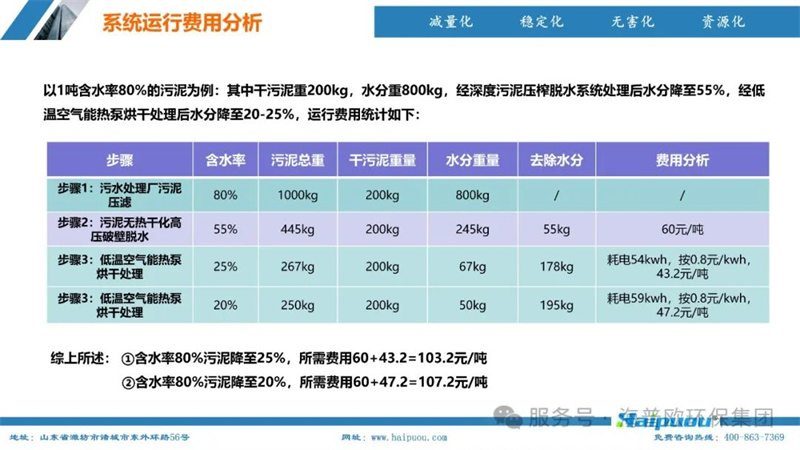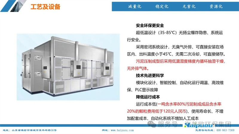 在項(xiàng)目實(shí)踐中,海普歐環(huán)保依托先進(jìn)的技術(shù)裝備和專業(yè)的服務(wù)團(tuán)隊,為市政污泥、管網(wǎng)污泥、工業(yè)污泥、河湖淤泥等多種污泥的處理提供了高效的解決方案。其污泥深度干化及資源化設(shè)備能夠?qū)⑽勰嗪式抵?0%以下,使污泥顆粒的低位熱值達(dá)到2200-3500Kcal/kg以上,可作為生物質(zhì)鍋爐燃料或摻混進(jìn)入循環(huán)流化床鍋爐燃燒,實(shí)現(xiàn)了污泥的減量化、無害化和資源化利用。以1噸含水率80%的污泥為例,經(jīng)過深度污泥壓榨脫水系統(tǒng)處理后,含水率降至55%,再經(jīng)低溫空氣能熱泵烘干處理,含水率可進(jìn)一步降至20-25%,運(yùn)行費(fèi)用僅為103.2-107.2元/噸,具有顯著的經(jīng)濟(jì)和環(huán)境效益。