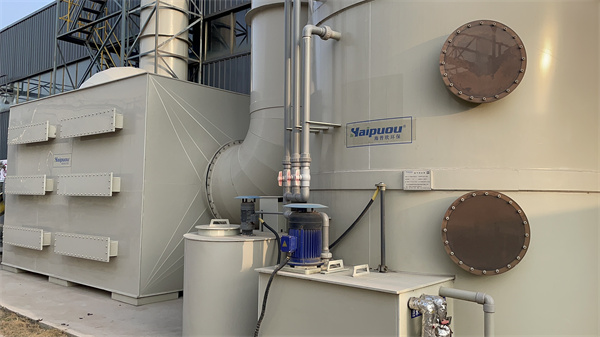 二級和一級噴嘴密度不同,噴液壓力不同,吸收酸性(堿性)氣體的濃度范圍也不同。噴淋段和填料段之間的接觸也是傳熱和傳質的過程。通過控制空塔的流速和停留時間,確保過程的充分和穩定。廢氣處理塔的上部是除霧段,這里去除了氣體中的吸收液霧滴,處理后的清潔空氣從廢氣凈化塔的上端排氣管排入大氣。